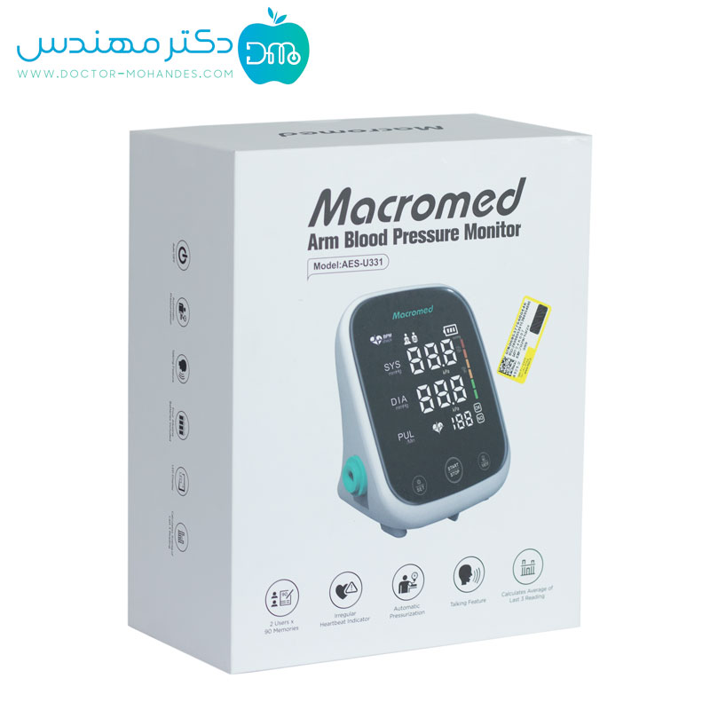 فشارسنج بازویی سخنگو ماکرومد-U331 محصول کشور چین و تحت لیسانس آلمان میباشد. این محصول علاوه بر اندازه گیری فشار خون قابلیت تشخیص آریتمی قلبی را نیز دارد که این ویژگی مناسب افراد دارای آریتمی قلبی و ناملایمات قلبی هستند میباشد. فشارسنج بازویی سخنگو ماکرومد از دقت بالایی برخوردار است و قابلیت دارای اندازه گیری میانگین مقادیر اندازه گیری شده است که کاربر می تواند روند فشارخون خود را ارزیابی کند و در صورت نیاز به پزشک مراجعه کند. یکی دیگر از ویژگی های این فشارسنج سخنگو ماکرومد 90 جایگاه حافظه برای 2 کاربر است که تاریخچه فشار خون کاربر را با تاریخ و ساعت ثبت میکند تا در صورت نیاز کاربر به پزشک مراجعه کند.